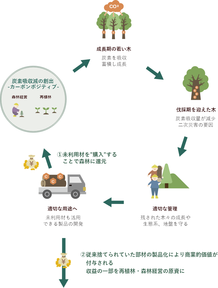 そしてこの森林サイクルを成立させるためには、本来使い道がなかった残材を“木材”として使用し、CO2を木の中に長く留めたまま活用できる方法を考えていくことも重要です。