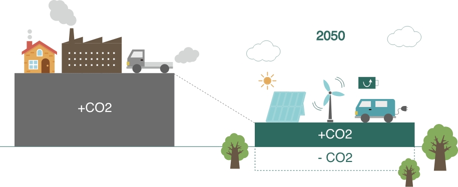 「排出を全体としてゼロ」というのは、CO2をはじめとする温室効果ガスの「排出量」から、植林、森林管理などによる「吸収量(人為的なもの)」を差し引いて、合計を実質的にゼロにすることを意味しています。